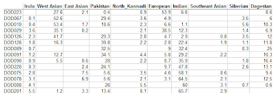 So DOD075 (Razib), apart from elevated South East Asian, has NO West Asian or Siberian, but HAS European and Dagestan - most interesting?!